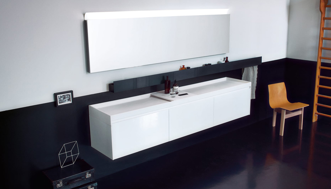 Evoluzione is a collection of countertops and storage units for the bathroom. The storage components are fitted with shaped doors, which can be opened and closed without the need for handles. The system is compatible with the majority of the washbasins in the Agape catalogue. The different variations of the Evoluzione system allow the creation of countless solutions for the bathroom environment. All the storage units of the Evoluzione collection are wall mounted, equipped with a large drawer and cut-out in the cover panel to be used in all positions and for all types of countertop. Manufactured by Agape.