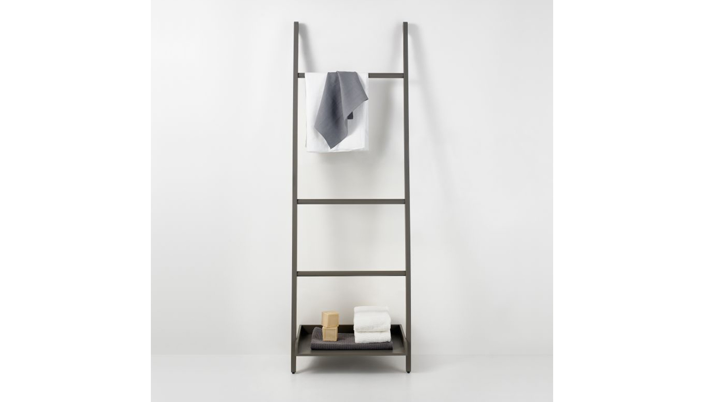 The Stairs rail system is rack that leans against the wall and can function in a number of different ways. In its simplest form, it is a towel rail. In its hybrid form, it is both a towel rail with one or two shelves. When presented completely with five shelves, it becomes a clever "stepped" storage solution. In any of its various forms, Stairs instantly becomes a visually engaging yet practical addition to the bathroom. Available in several natural wood and painted finishes. Manufactured by Agape.