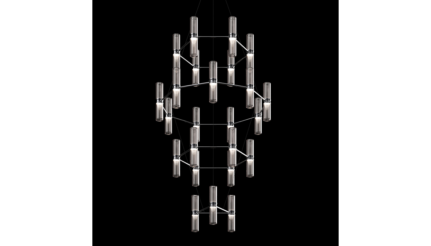 Zephyr is a minimalist, elegant chandelier with a modular frame that enables infinite custom layouts to be designed to fit the needs of each project. The modular element is a double cylindrical diffuser with a central body that encloses the light sources and, by means of two rings rotating on the same axis, defines the position of the neighboring lighting bodies by positioning the connecting structural elements. The diffuser is transparent glass hand-blown in a mold with a wavy edge shape whose vertexes are then ground to create a horizontal texture that alternates transparent and opaline diffusing stripes. This workmanship elegantly enriches the diffuser but above all creates a glare-free diffusion of light along the cylindrical body. It is a contemporary interpretation of the traditional chandelier: the craftsmanship of the glass is combined with a simple shape and an optical flair to reinterpret glass processing technologies, not just through decorative pieces, but also as functional tools for controlling and distributing light. Manufactured by Artemide.