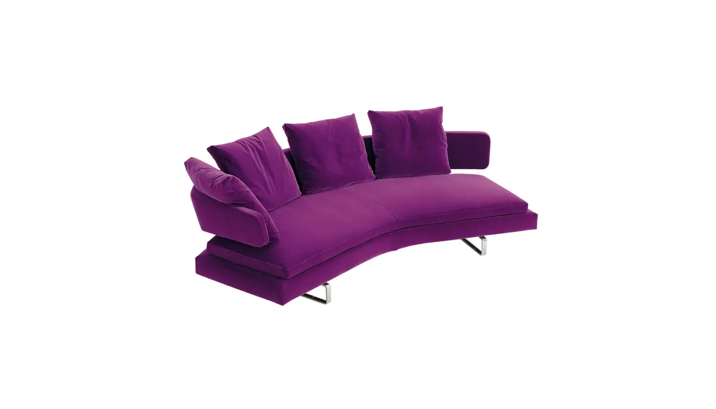 Designed to create the setting for leisure activities, Arne stands out for the curved shape that envelops the user. It is an invitation to socialize and share moments together, to converse and watch television shows on a large screen. Perfect in the center of the room, when placed against the wall it loses none of the sense of comfort and lightness conveyed by the aluminum supports on which both the seat and backrest seem to be suspended. Manufactured by B&B Italia.