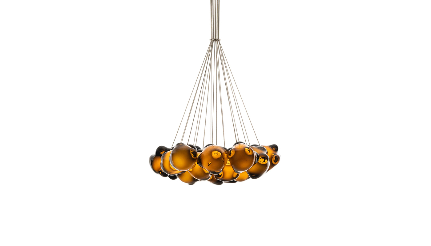 The 57.19 cluster suspension light is made with nineteen 57 pendants and is designed to be composed in an atmospheric configuration. The 57 production technique involves trapping voids of air of different sizes and configurations within a glass matrix, yielding a shape loosely referencing a rain cloud. These pockets of air remain invisible when the piece is off, but come alive to reveal an interior universe when the piece is illuminated. Three 1.5W LED long life bulbs are included. Approved to UL Standards by CSA. Manufactured by Bocci.