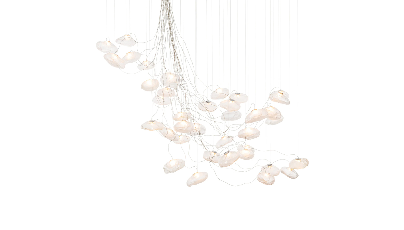 The Bocci 73.37 sculptural suspension light is formed by blowing liquid glass into a folded and highly heat-resistant ceramic fabric vessel. The resulting shape has a formal and textural expression intuitively associated with fabric, which becomes permanent and rigid as it cools. A flat LED is positioned to fill the resulting volume with diffuse light, accentuating the volumetric perception of the piece. By virtue of the loosely controlled manufacturing process, each 73 is completely unique in proportion, size, and shape. 73s are intended to nestle together in groups, creating complex compositions that resemble clouds. Thirty seven 10 watt Xenon (dimmable) or 1.5 watt LED bulbs are included. LED version is dimmable when using a compatible dimmer supplied by others. Approved to UL Standards by CSA. Manufactured by Bocci.