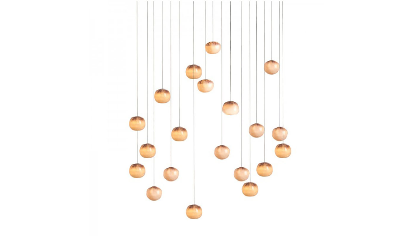 A white glass moil is captured inside a fine copper mesh basket and then plunged into hot clear glass. Air is blown into the matrix to gently push the white glass through the mesh, creating a delicate pillowed form that is suspended inside the thick outer layer of clear glass. Sometimes the copper mesh basket folds and crinkles, adding specificity to each piece. Undulations in the exterior shape are a natural consequence of the fabrication process and accentuate the gentle white pillowing below. A low-voltage xenon or LED light source is introduced into the piece, casting a warm coppery hue. The 84.20 suspension light is available with twenty pendants and has a white powder coated canopy. The 84.20 light weighs approximately 149 lbs and requires twenty 10W (dimmable) Xenon or 1.5W LED bulbs, which are included. The LED version is dimmable when using a compatible dimmer supplied by others. Approved to UL Standards by CSA. Manufactured by Bocci.