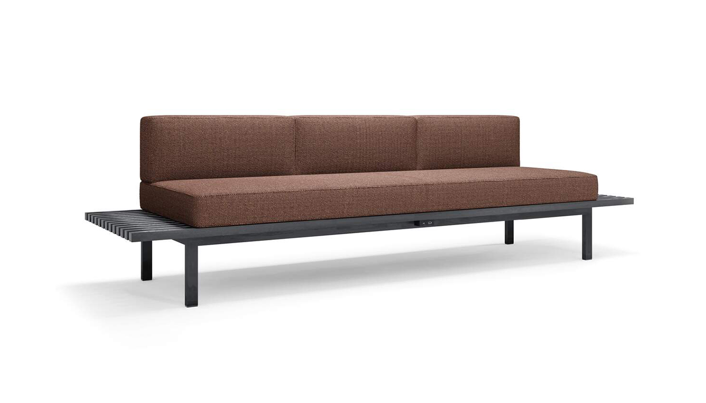The Banquette Mauritanie, with its sophisticated, timeless design, is among the furnishings designed by Charlotte Perriand in 1959 for the homes of the managers and staff of the "Miferma" mining company in the city of Cansado, on the Atlantic coast of Mauritania. Composed of magnificent wood lattice attached to an elegant metal base, the bench can be used without cushions to accentuate its long, lean structure. With a single two- or three-seat cushion placed at the centre or along the sides of the bench, it invites various interpretations of use. Or, backrest cushions can be added that are attached to the seat in such a way as to allow them and the upholstery to be easily removed. Furthermore, to best respond to contemporary needs, the bench can be equipped with integrated USB sockets (type A and C). As with all of the items in the Cassina iMaestri Collection, each piece is authenticated by the collection logo, Charlotte Perriand's signature and by a serial number that matches its ID card. Manufactured by Cassina.