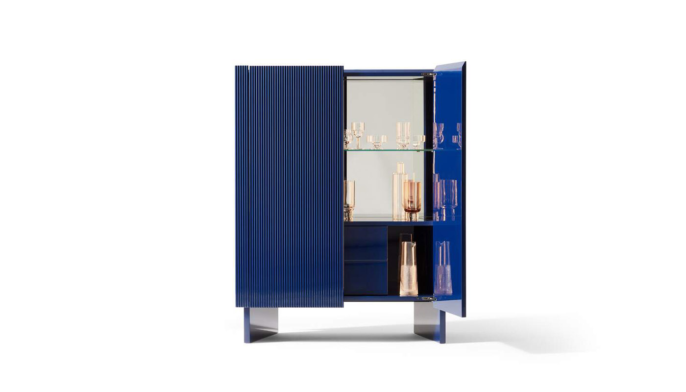 With her unmistakable design signature, what Patricia Urquiola creates is an invitation to travel, in the form of furniture - through the Hayama collection, made up of a cabinet, bar, hutch and console - all inspired by the traditional Japanese Haori jacket that is worn over a kimono. These elegant lacquered pieces of furniture are a figurative example of the place where the finely crafted oblique legs meet the ancient art of lacquer finish, terrain upon which the Meda artisans thrive. The cabinet, in particular, stands on oblique legs in elegant contrast to its horizontal lines of the upper part, becoming the distinctive trait of a minimalist shape. The bar elicits a striking visual effect that lends depth to any space through a mirror that, on three sides, frames a shelf in extra-clear glass, while the lower part, made up of two centre drawers and two side compartments, is illuminated by LED lights. Hayama is also a hutch and a console envisioned for an entry or foyer. The collection is available in a version with cannete doors or with smooth finish to highlight even more the geometric contrast between the horizontal lines and the verticality of the front. Manufactured by Cassina.