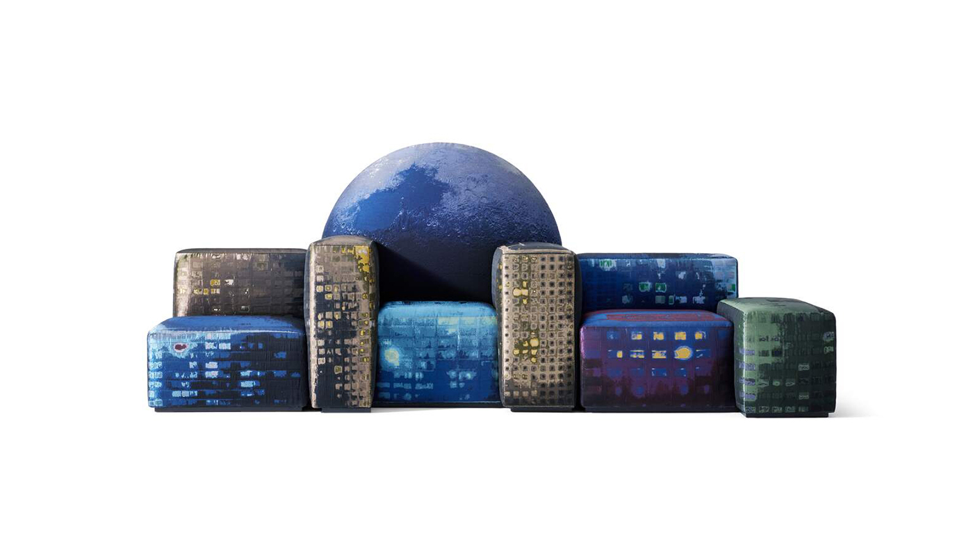 The New York skyline in a sofa, from the genius of Gaetano Pesce. Design becomes narrative in this visionary work that returns in a special series of 50 pieces. This imaginative creation is a new chapter in a story begun in the 1980s with Tramonto a New York, the work with which Pesce surprised his adoptive city at sunset to then return the image through a series of spacious upholstered pieces arranged as if to reproduce its skyline. The three-seat sofa combines eloquent energy and meticulous structural functionality. The system comprises nine skyscraper-modules that serve as seats and armrests, joined to one another by fasteners. The backrest portrays a giant full moon - through this work, Pesce reveals to the world its mysterious side, not visible from Earth. Cassina reinterprets Notturno a New York in a version with a conscious soul. The padding of the new edition is made of recycled PET fibre, introduced as standard in the upholstered pieces, and reducing to a minimum the use of polyurethane, crafted with a percentage of polyols derived from biological sources. The upholstery is in an exclusive fabric with a design made specifically for this product.s. Manufactured by Cassina.
