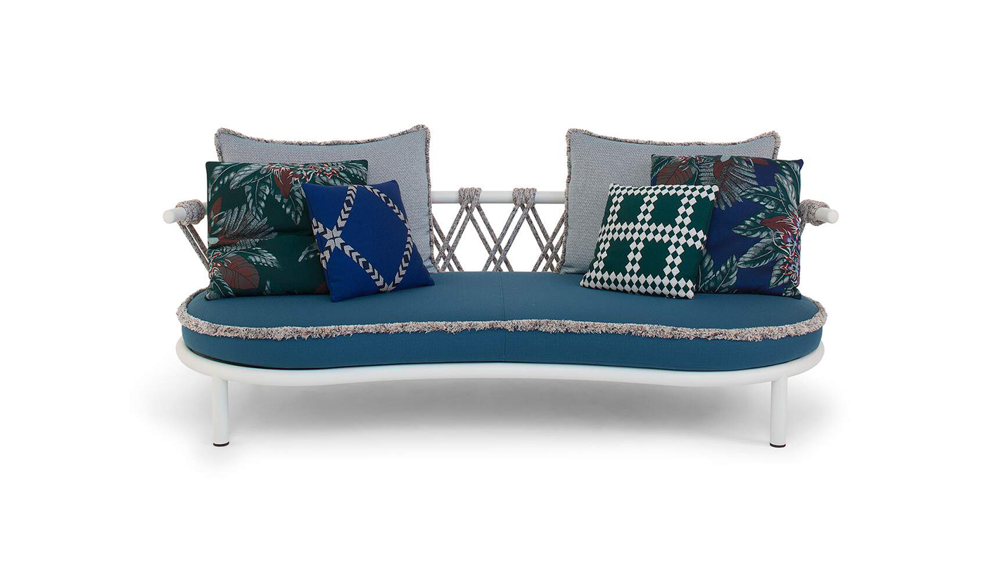 Patricia Urquiola interprets the joy of open-air living with a playfully designed outdoor collection; filled with soft, curvy shapes, it takes a conscious approach to the environment by using innovative, circular materials developed through research conducted by Cassina LAB, born from the collaboration with POLI.design at the Milan Polytechnic. The two-seater sofa and the three combinable modules - to create inviting arrangements - have a stainless-steel structure with painted finish; it supports panels in RFM®, a hand-finished recycled fiberglass material. The backrest features a handcrafted polypropylene and nylon woven cord while the backrest cushions and seat cushion are padded with PET-derived recycled fiber wadding covered in water-repellent polyester fabric. A distinctive decorative element, the optional fringe on the cushions is available in the same shade as the cord. Manufactured by Cassina