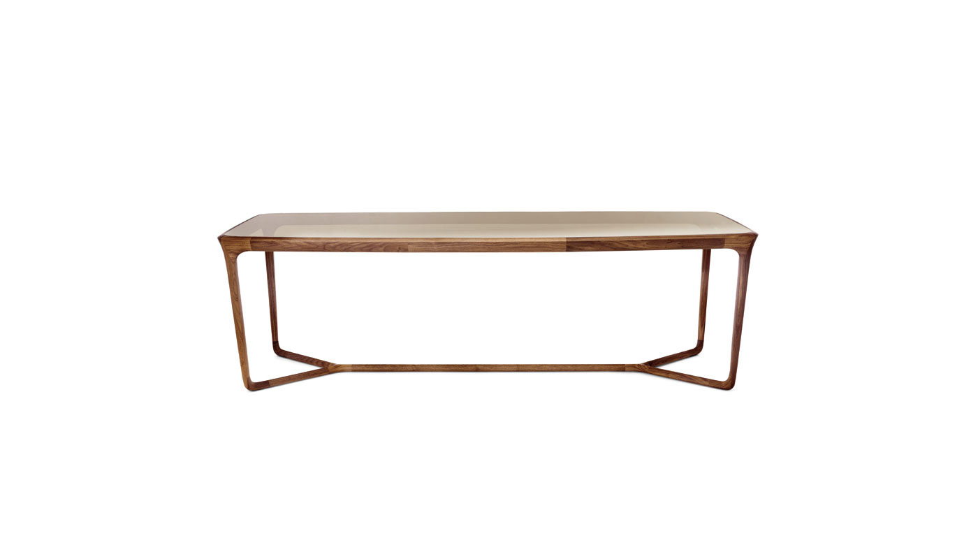 Table with structure and central cross base made entirely in solid American walnut. Top in wood or visarm glass, transparent, smoked or bronzed. Manufactured by Ceccotti.