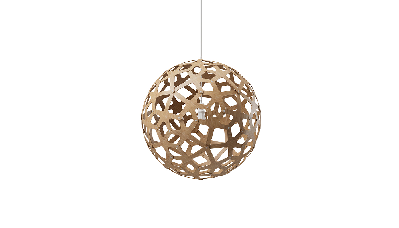 Trubridge describes this suspension light as a "form based on the structure of a geometric polyhedron." The Coral light is constructed from a single repetitious shape made of untreated bamboo ply. It is available in a variety of finishes and color options. The Coral 600 suspension light ships as a flatpack with assembly required. For an upcharge, the light can be shipped fully assembled or in custom colors. Contact Switch Modern at info@switchmodern.com or 404-605-0196 for more information. UL approved components. Manufactured by David Trubridge Design.