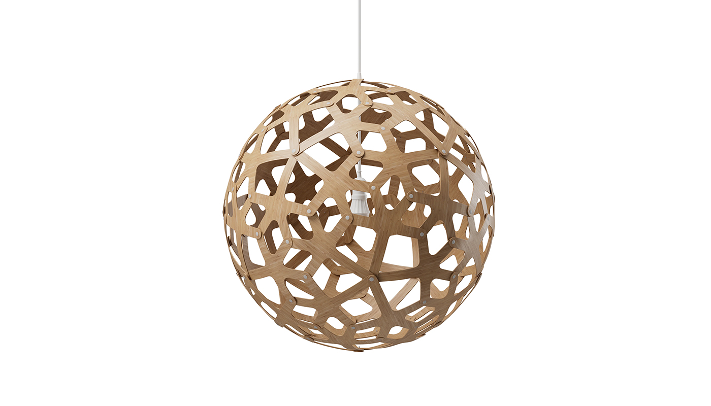 Trubridge describes this suspension light as a "form based on the structure of a geometric polyhedron." The Coral light is constructed from a single repetitious shape made of untreated bamboo ply. It is available in a variety of finishes and color options. The Coral 1200 suspension light ships as a flatpack with assembly required. For an upcharge, the light can be shipped fully assembled or in custom colors. Contact Switch Modern at info@switchmodern.com or 404-605-0196 for more information. UL approved components. Manufactured by David Trubridge Design.
