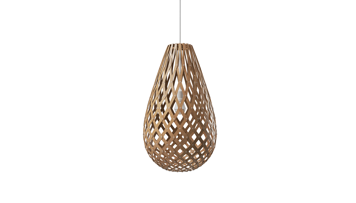 The droplet-like form of the Koura suspension light mimics the curled form of New Zealand's native freshwater shrimp koura, named by the indigenous Maori people. David Trubridge was also inspired by the intricately made traps used by early Maori to catch koura. A markedly sculptural piece that has a strong visual presence, Koura is available in a wide range of sizes and finishes. The Koura suspension light ships as a flatpack with assembly required. For an upcharge, this light can ship fully assembled. Contact Switch Modern at info@switchmodern.com or 404-605-0196 for more information. UL approved components.  Manufactured by David Trubridge Design.