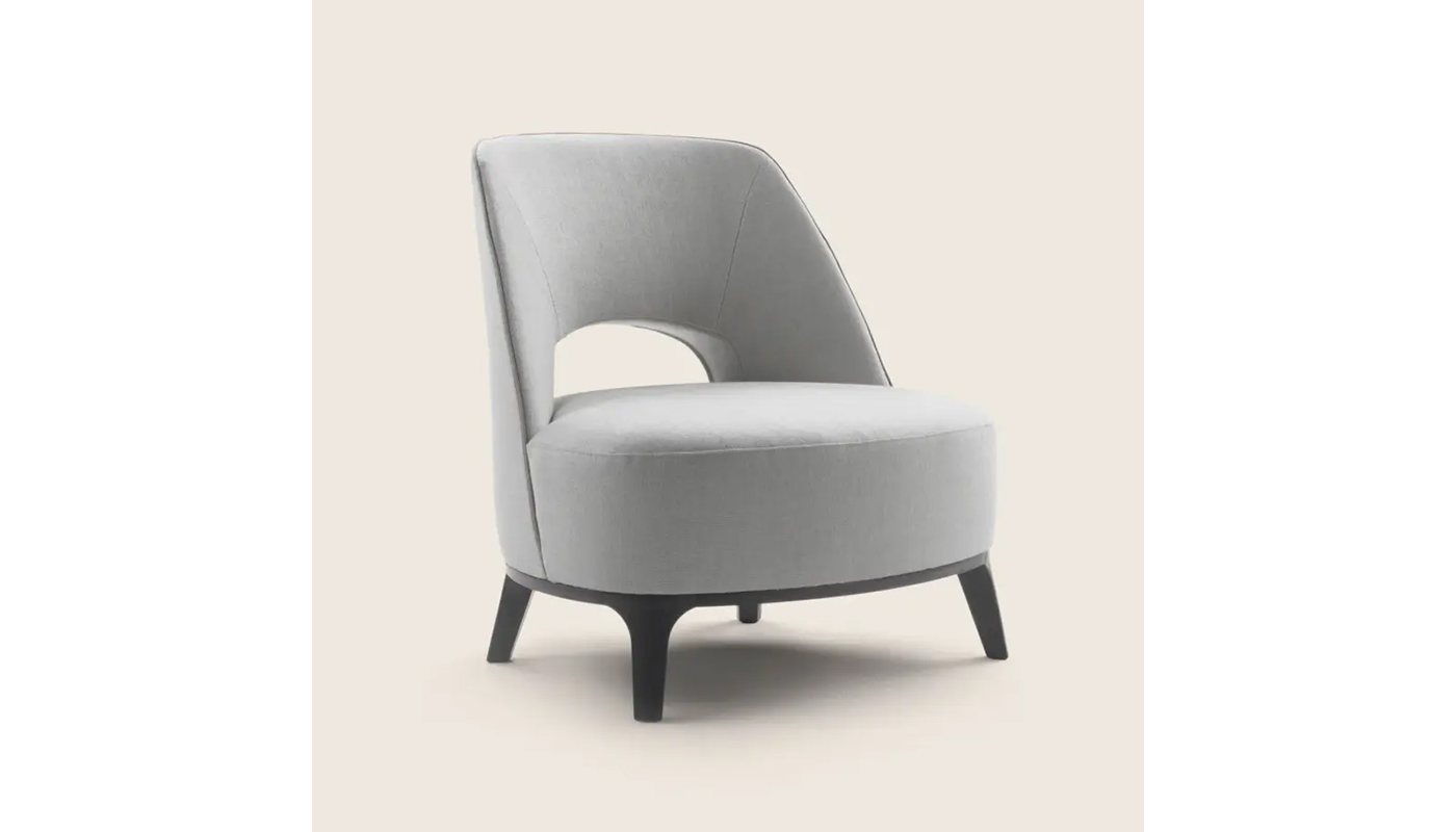 Its mythology-inspired name serves to underscore the delicately graceful lines of the Ermione lounge chair. Understated proportions add to Ermione's versatility; with a charisma all its own, this is a lounge chair that can effortlessly enhance the decor in any setting. The enveloping upholstered seat back gains a lighter look thanks to an exquisitely sculpted opening above the seat. The graceful lines and vaguely retro charm of the Ermione armchair are also reflected in its base, made in cast aluminum or in solid wood in an array of sophisticated shades. Manufactured by Flexform.
