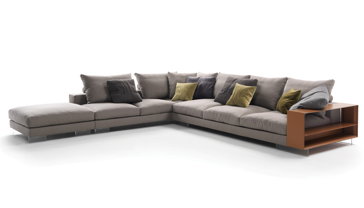 The Lightpiece sectional sofa is constructed from a metal and wood frame with plush padding covered with a fabric lining. The seat cushions of the contemporary leather sectional are filled with down and a supportive core. The Lightpiece sectional features backrest cushions filled with down. Optional leather covered and powder coated bookcase arm units available. Upholstery is removable fabric or leather covers. Optional ottoman also available with the Lightpiece sectional. Many Flexform designs feature removable upholstery covers. Manufactured by Flexform.