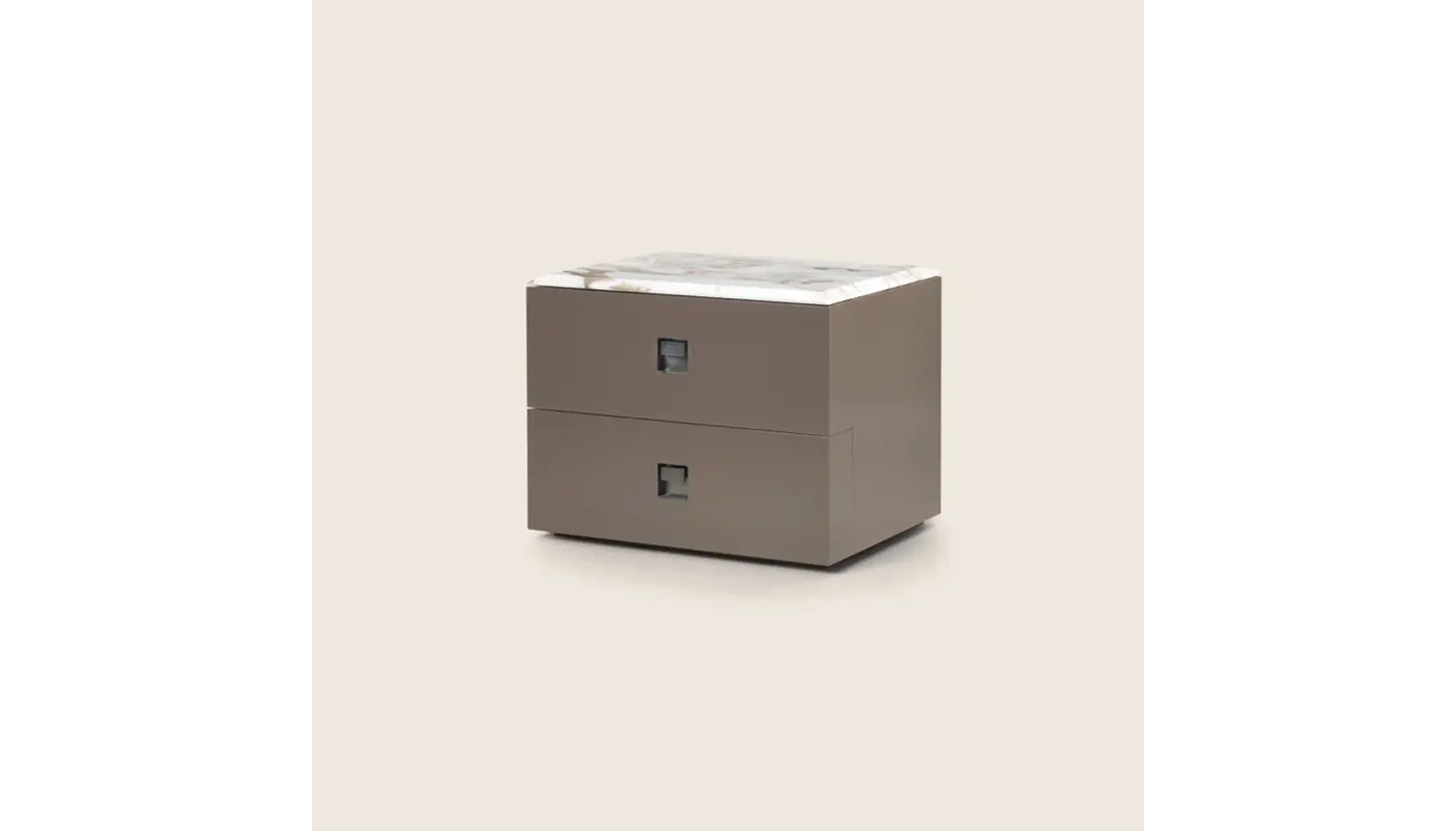 This furniture collection - vertical cabinet, chest of drawers and night stand - combines clean lines, luxurious materials and exquisite construction details. The structure, like the drawer and door fronts, is in ash with glossy mocha color lacquer finish, while the marble top features an unusual diamond cut that, along with the metal drawer pulls - available in a number of finishes - lends lavish sophistication to these cabinets. Manufactured by Flexform.