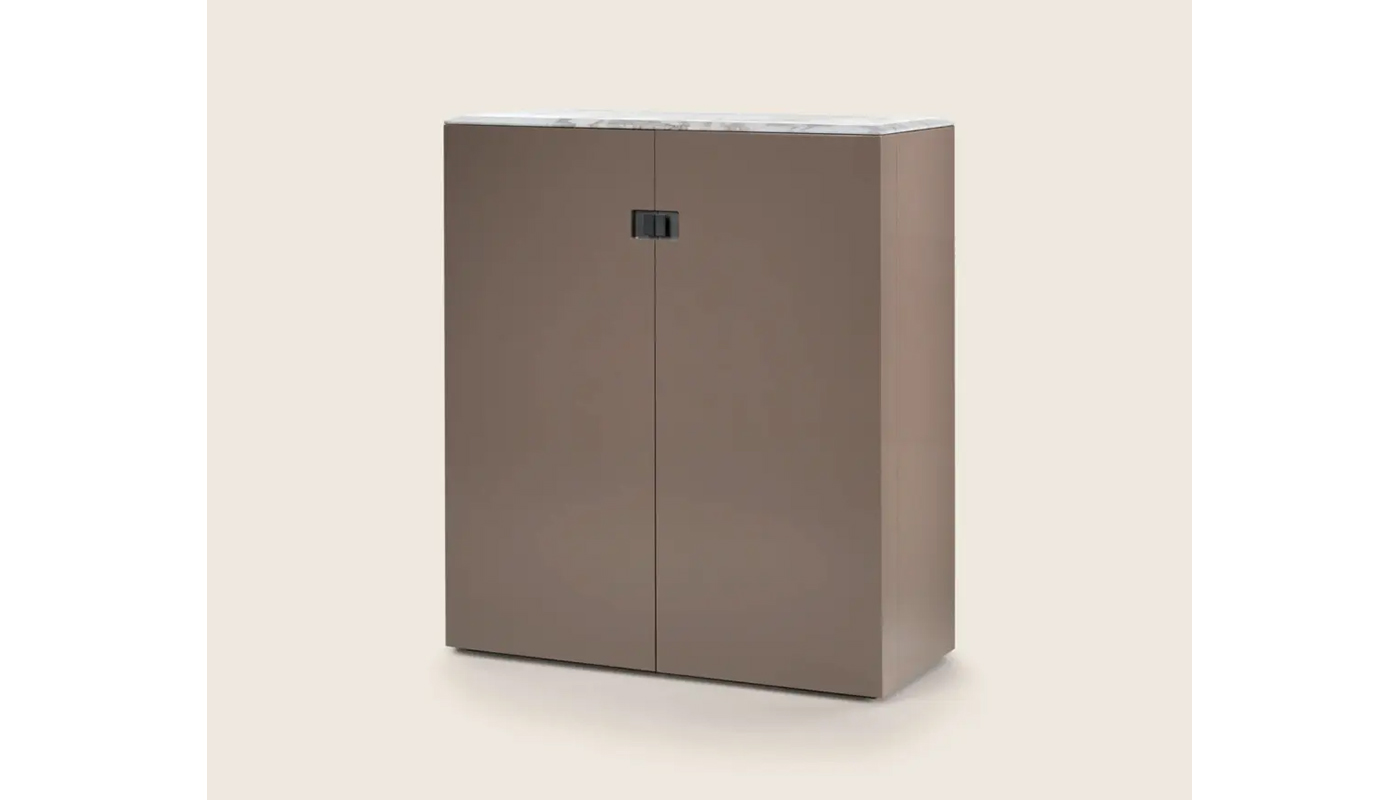 This furniture collection - vertical cabinet, chest of drawers and night stand - combines clean lines, luxurious materials and exquisite construction details. The structure, like the drawer and door fronts, is in ash with glossy mocha color lacquer finish, while the marble top features an unusual diamond cut that, along with the metal drawer pulls - available in a number of finishes - lends lavish sophistication to these cabinets. Manufactured by Flexform.