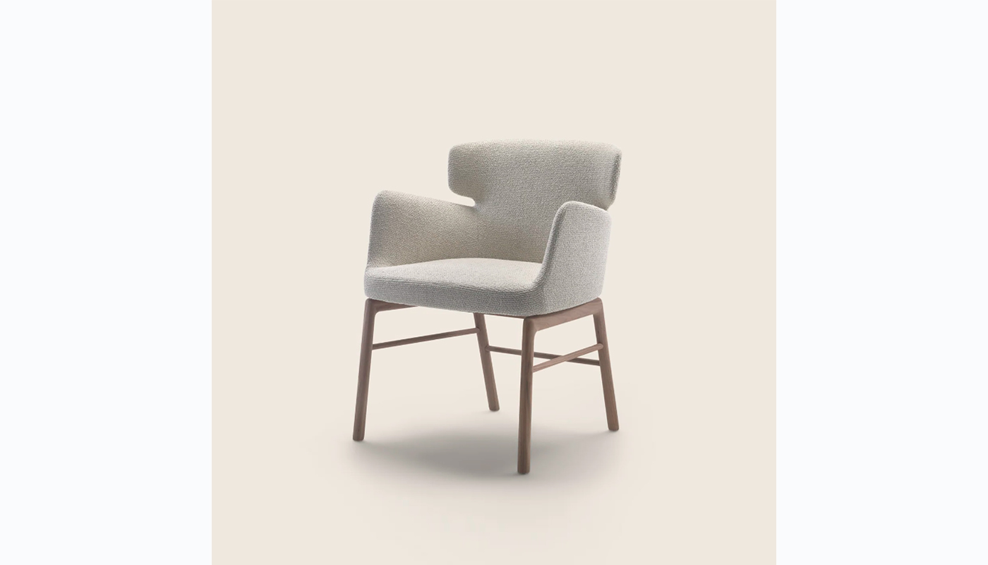 The name of the Vesta dining chair is inspired by the ancient Roman goddess of hearth, home, and family. This chair features enveloping lines and well-balanced proportions. The shape of the shell, made of cold-processed polyurethane foam covered with soft padding, was designed to conform to ergonomic standards and ensure a high degree of comfort. The hand-finished base is made of solid wood. The many finishes available for the base and the broad array of leather and fabric upholstery options make Vesta an especially versatile chair that lends an air of understated elegance when paired with any table. Manufactured by Flexform.