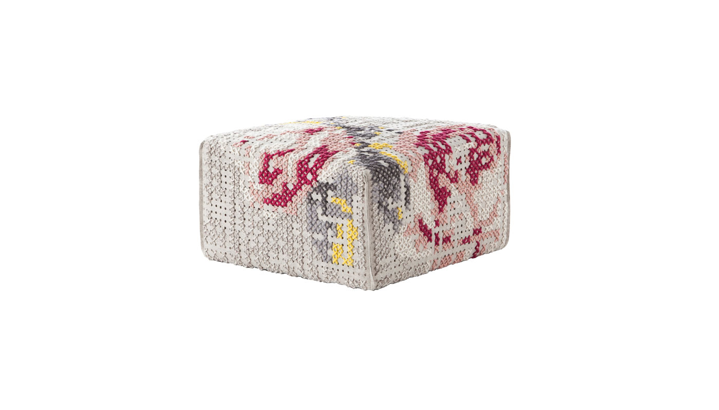 Charlotte Lancelot revisits classical techniques: a cross, a pixel. The Canevas Square ottoman is created using a perforated soft felt base with interwoven threads of wool. Manufactured by GAN.
