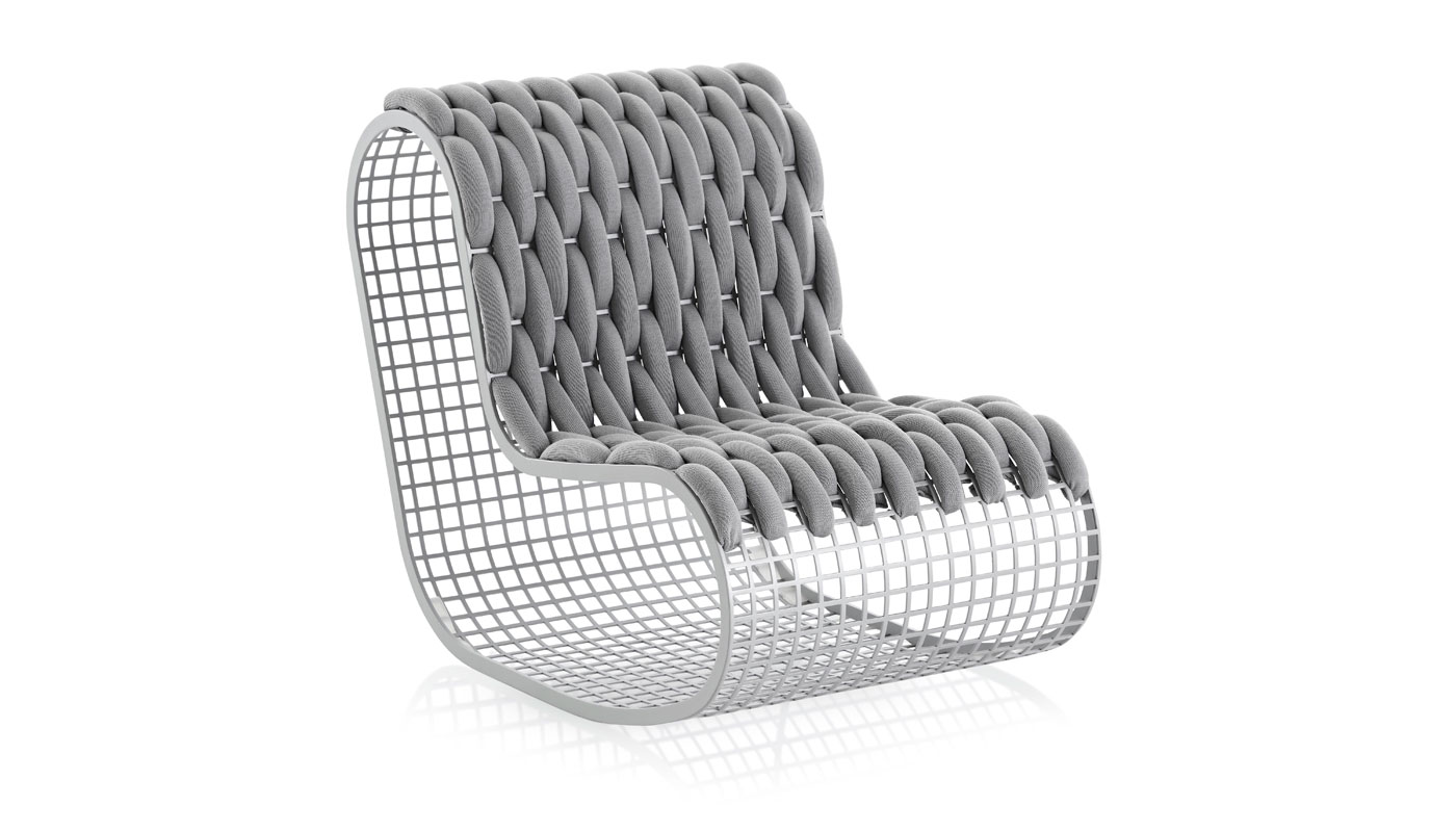 The Buit Club lounge chair was conceived as an ultra-light aluminum mesh carpet interwoven with textile to create a different ways of sitting. From the aesthetic point of view, Buit brings visual lightness. As it is a folding sheet, the visual impact on the space is less than that of other volumetric furniture. It is easy to combine and integrate in outdoor spaces. The optional woven tube braided on the structure is reminiscent of wool and provides a touch of warmth. Manufactured by Gandia Blasco.