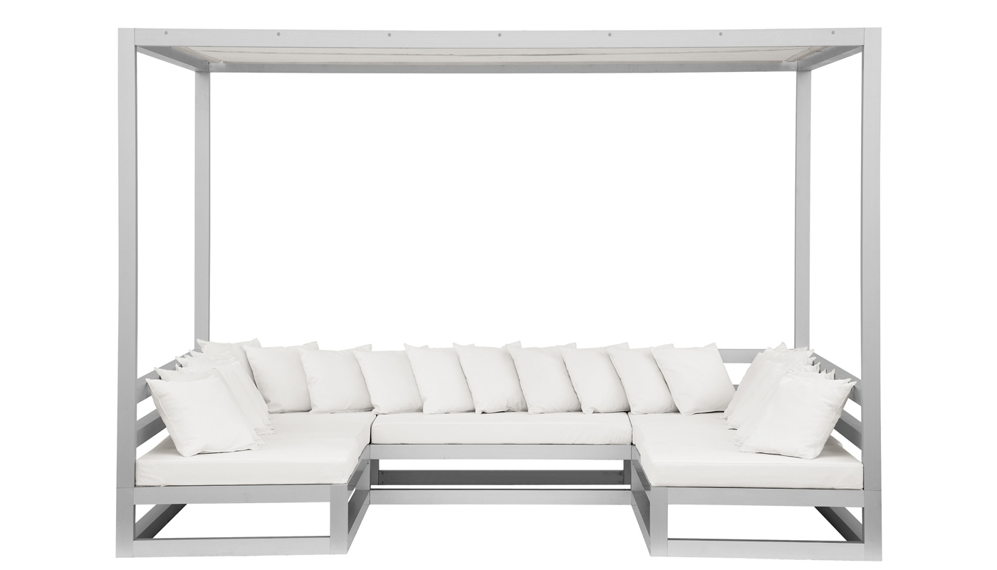 With its substantial footprint and "ceiling," the Pergola sofa has a physicality akin to a room. Indeed, the perimeter of rectilinear rails that support the back cushions functions like a retaining wall. The Pergola sofa is constructed in anodized aluminum and features an elevated seat platform and a canopy of plastic fabric. The cushions are composed of polyurethane foam rubber covered with water-repellent fabric. The associated textile covers of the cushions are removable. Pillows function as back rests and are included. A variety of additional finish colors and textile options are available. Manufactured by Gandia Blasco.