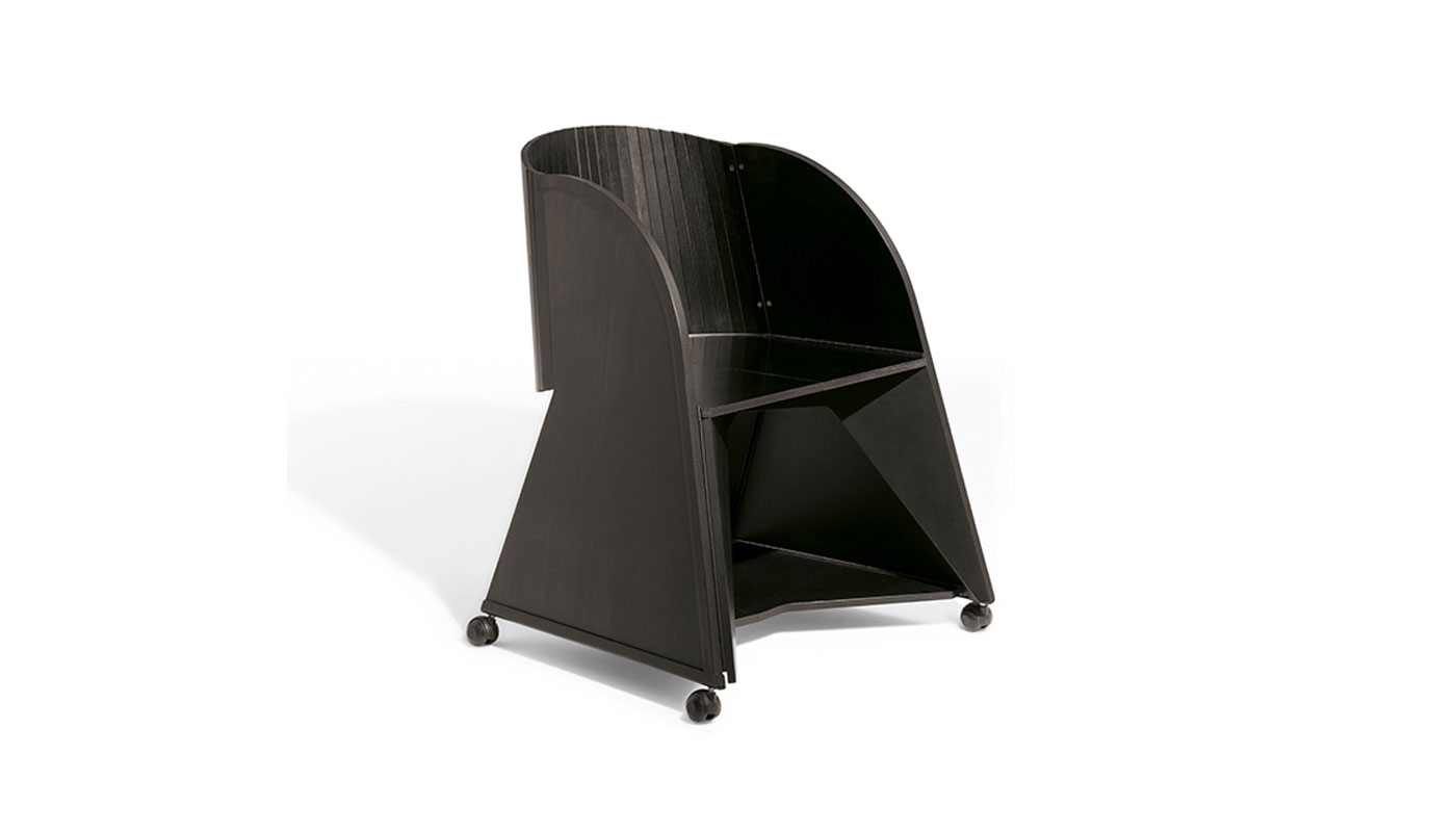 The 50250 dining chair is crafted in beech wood with castors to facilitate movement. This small, folding dining chair is an example of technology and great originality. The closing joints in the middle of the seat and the back are flexible wooden slats. Manufactured by Giorgetti.