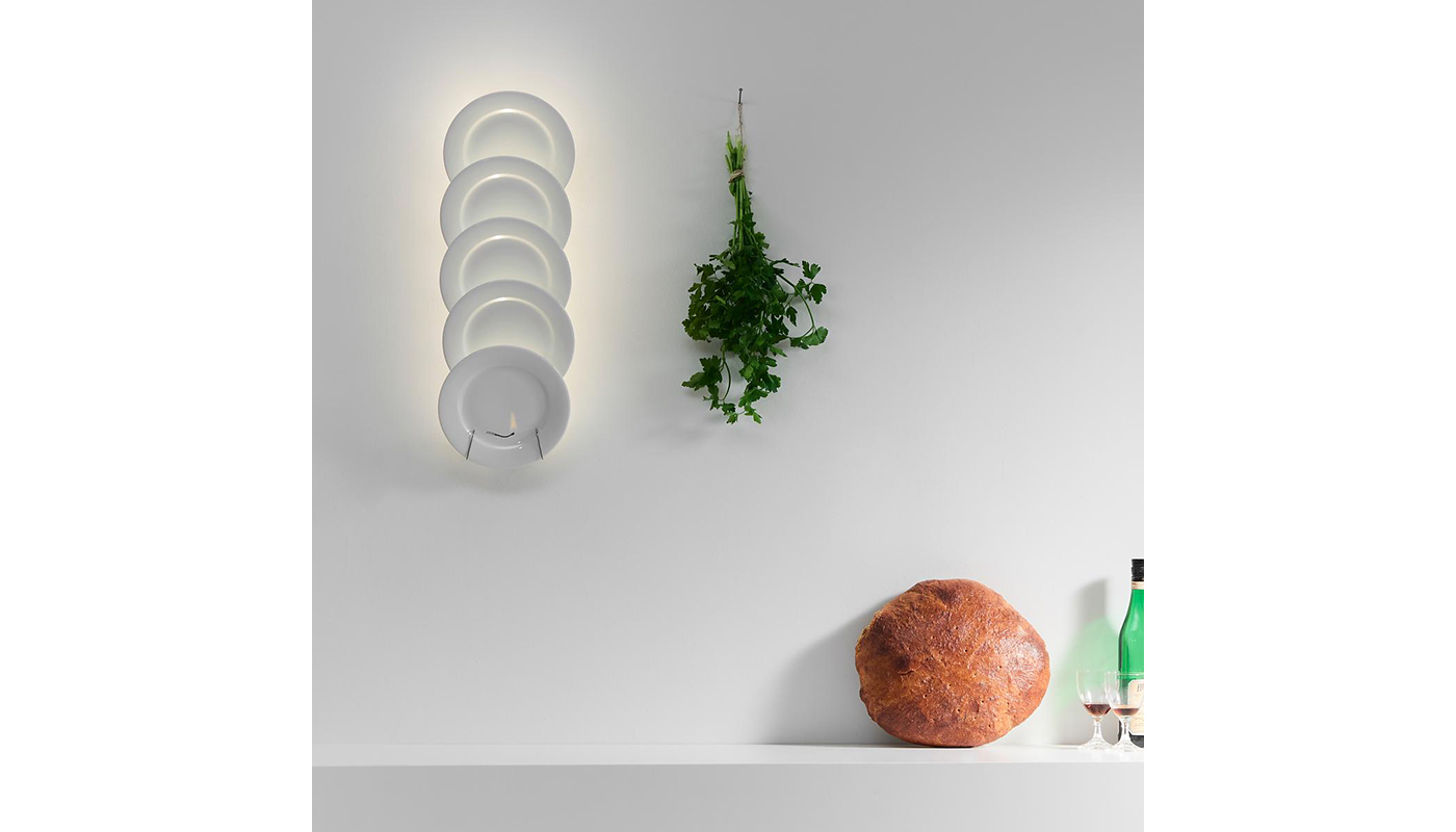 Jasna Kuchnia transforms a simple plate holder into a fascinating light object. The wall lamp consists of five white porcelain plates arranged on top of each other. A narrow LED line, mounted behind the plates, gently illuminates the porcelain. The light refracts in the material and is reflected in finely graded brightness levels. A dynamic interplay of light and shadow is created. Thanks to its flexible design options, Jasna Kuchnia can be individually adjusted. The plates are movable on the sides, allowing the arrangement to be either vertical or slightly offset. Those who wish for a larger installation can easily expand the lamp with an additional element to create a series of ten or more plates. The design team has also come up with another clever optical effect: A small, dark matchstick is depicted on the front plate. When turned on, the light seems to ignite it - a subtle illusion that emphasizes the playful character of the design.nbsp; Manufactured by Ingo Maurer.