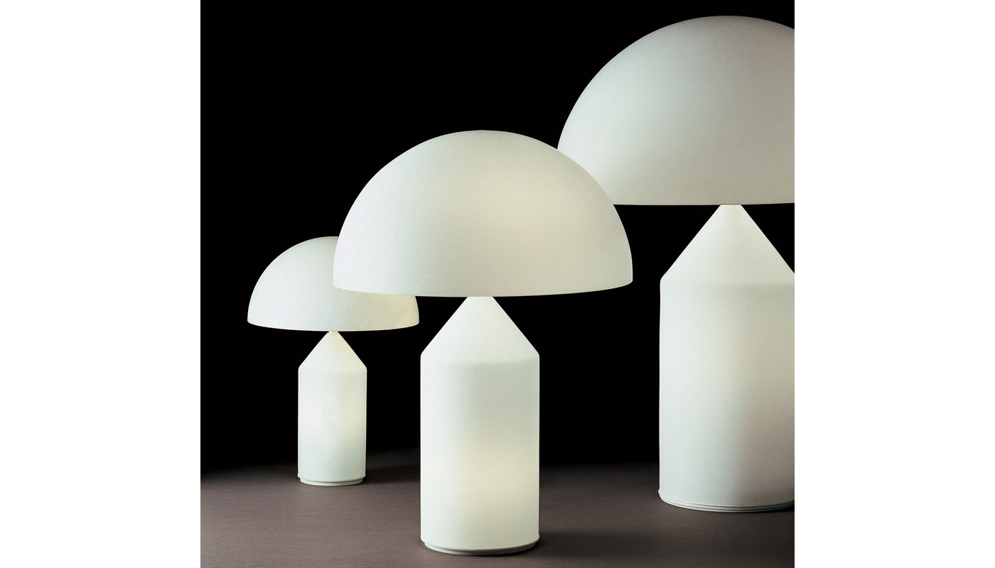 The Atollo lamp has become one of the best known symbols of 20th century Italian design. Atollo features a cylindrical base with a conical top akin to the shape of a sharpened pencil – its large hemispherical diffuser appears to impossibly rest upon an imagined point of this cone. This “tip” doesn’t exist but like a sharpened pencil, the viewer imagines one to be there. This engaging illusion of visual precariousness is part of the profound sense of wonder that Atollo engenders. The interior of its hemispherical diffuser is finished in white so that light is diffused downward – most noticeably onto the cone portion of the base that visually becomes like an island engulfed in shadow. The metaphor from which we suspect that Vico Magistretti chose the lamp’s name… Atollo quite literally means “island” in Italian.