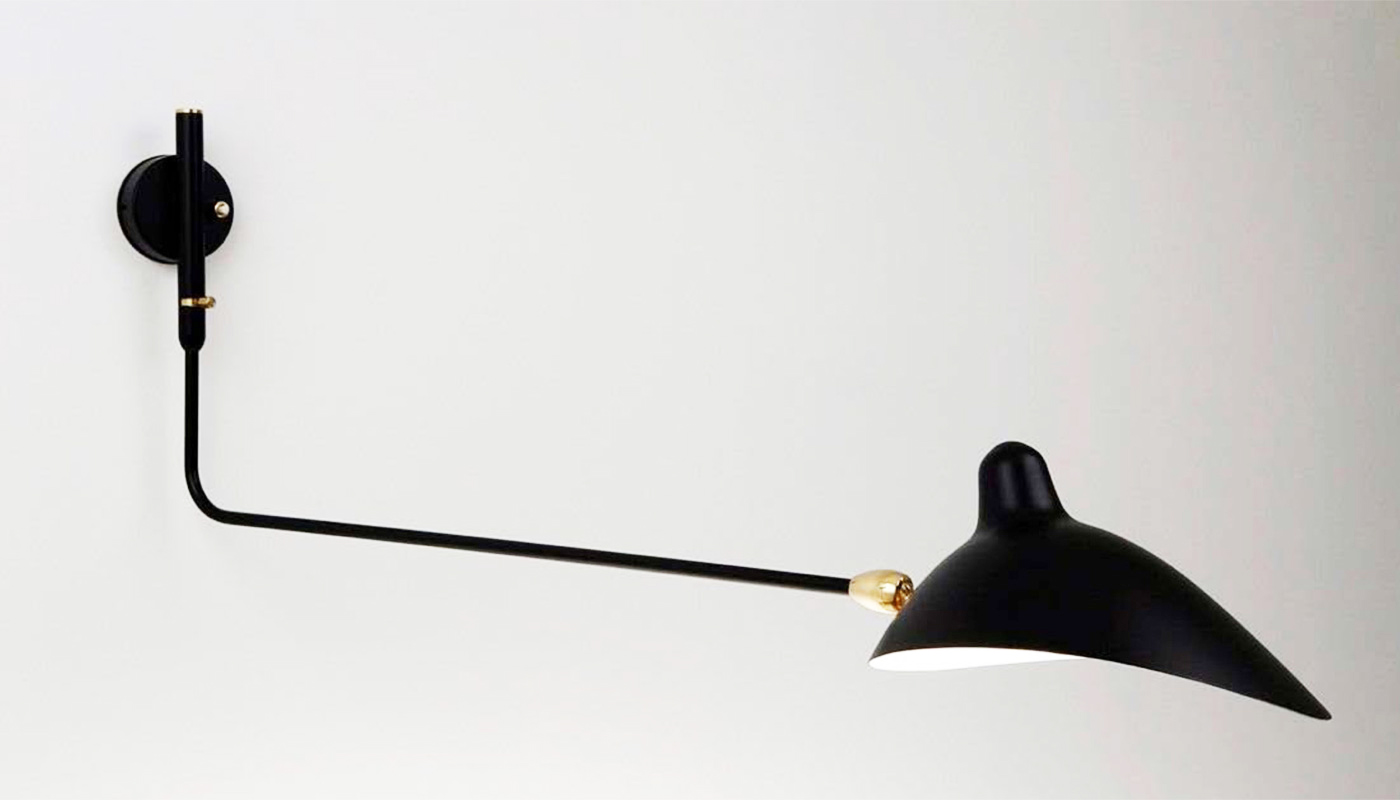 Throughout the 1950s Serge Mouille designed large, angular, insect-like ceiling-mounted and standing lamps with several arms along with smaller wall-sconces - all engender a kinetic, sculptural aesthetic that evoke a movement. Mouille claimed his lighting fixtures were "a reaction to the Italian models, which were beginning to invade the market in 1950," and which he thought to be "too complicated." His designs from this period were shown mainly at the legendary Steph Simon Gallery in Paris that also exhibited the work of Jean Prouvé, Charlotte Perriand, Isamu Noguchi, and Jean Luce. Mouille's designs have been widely exhibited and are included in the permanent collections of New York's Museum of Modern Art and the Centre Pompidou, Paris.