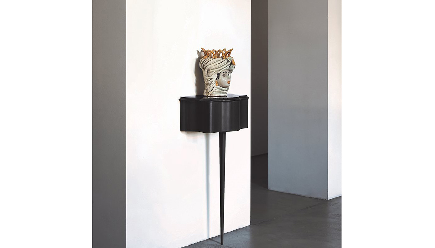 The Carlino CM night table is made of black or white lacquered solid wood and is supported by a single pointed leg. The drawer slides internally on a wooden guide and is refined with a leather pad that covers the bottom; the top is in black or white back painted glass. The Carlino CM table must be fastened to wall. Manufactured by Zanotta.